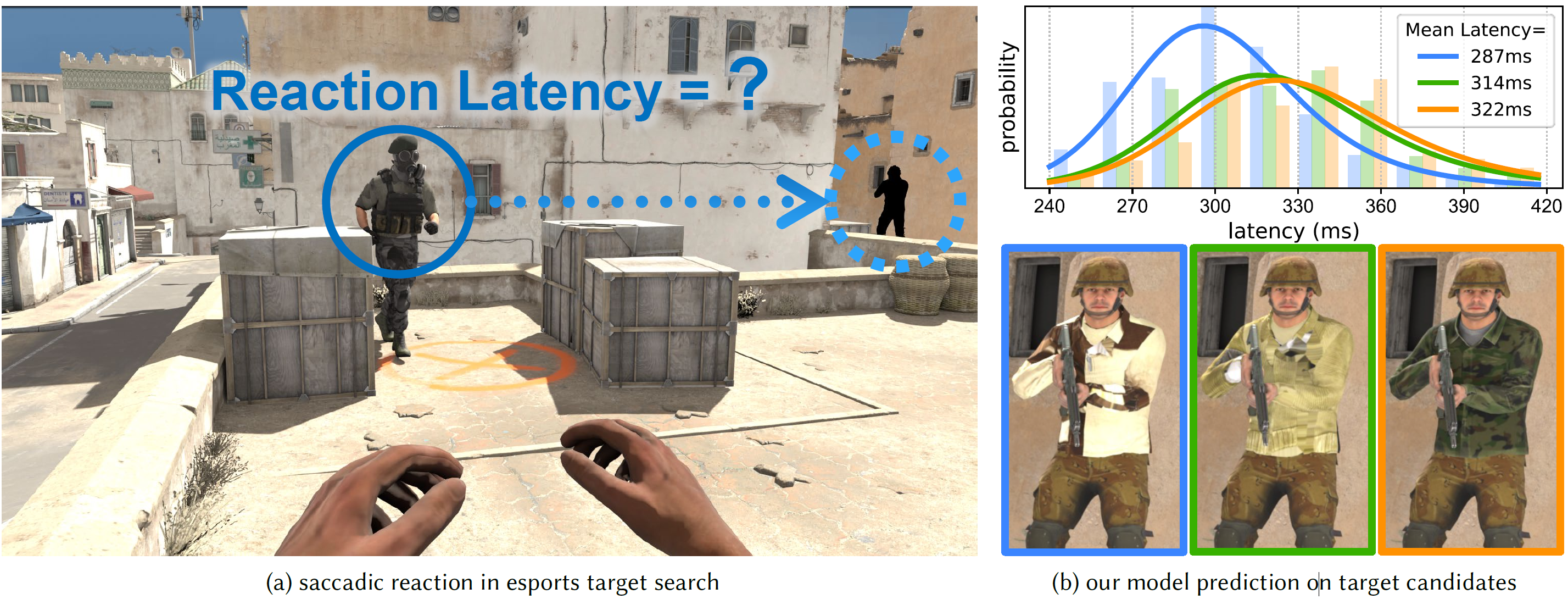 We propose a model which predicts the reaction latency for users to identify and saccade to a peripheral target. Based on our psychophysical data collected for stimuli with varying visual characteristics, we model the likelihood distribution of the time users take to process, react, and saccade to a target. If replacing the black placeholder in (a) with the three target candidates shown in (b), the resulting retinal images exhibit identical perceptual similarity in terms of visual acuity, with all FovVideoVDP scores >9.5 per [Mantiuk et al. 2021]. However, they may trigger significantly faster (leftmost of (b)) or slower (rightmost of (b)) reaction latencies with up to about 35ms difference, significantly affecting task performance. 3D asset credits to Valve Corporation, and Slavyer at Sketchfab Inc.
