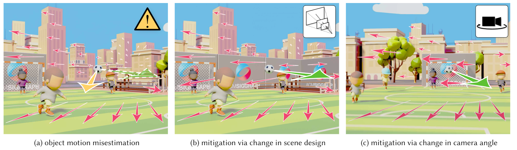 (a) shows a common animation and gaming scenario where the observer has to estimate the motion of a soccer ball in a 3D scene. Due to perceptual errors in estimating motion vectors in screen-displayed graphics, we may significantly misestimate the direction of the soccer ball (estimated leftward yellow vector vs. actual rightward green vector). For an animated example, see the supplementary video. To mitigate motion estimation inaccuracies and enhance task performance and perceptual fidelity, our perceptual model measures the correlation between estimation error, and scene dynamics and content. These predicted measures lead to content designs optimized for minimizing perceptual errors in motion estimation, such as by adjusting scene depth with an added wall (b) or by altering camera angles (c).