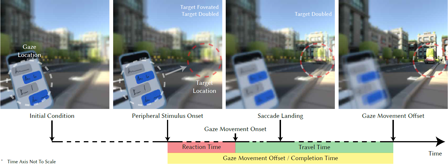 Our model predicts the completion time of stereoscopic eye movement toward a target in the visual field. It provides a probability distribution of the duration between the onset of the target and the first moment we can see it in a clear, unfoveated manner, accounting for both saccadic and vergence changes necessary to do so. (a) When users focus their gaze on a specific 3D target, objects at a different depth appear doubled (due to incorrect vergence), blurred (due to peripheral vision), or both. (b) A peripheral target might trigger a gaze movement of both the left and right eyes, which initiates after a reaction time necessary for cognitive processing. (c) First, the conjugate and ballistic saccadic movement lands the target into foveal vision with high acuity; but we may still see double vision due to the slower, incomplete vergence movement. (d) Once the disconjugate vergence movement also completes, we can successfully fuse the stereoscopic imagery and see the target clearly.
